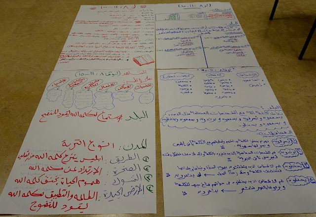 Through the afternoon on that Day Three, they had an opportunity to have a go themselves, preparing sermon outlines on Colossians 1.28-29. Still no notes (although I urged them to read through them on their own and bring back their questions). Then, through the afternoon on Day Four, they had another opportunity to practise the process, this time with Luke 8.11-15. As the translator worked through their sheets with me, I was delighted. Rarely have I seen such an accurate grasp of the basic idea after just the second effort. Still no notes. This is the work they produced (for those of you who know Arabic, not too many, I suspect!):