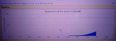 It gets worse. Look at this little graph that I discovered (yes, sorry, it is very little). The horizontal axis is a time line (1750-2000). The vertical axis is the percentage of hymnals in which the hymn can be found. Allow me to interpret the graph for you. This hymn was born into the hymnal world in about 1900, but its life has always been endangered, peaking at a presence in a whopping 20% of hymnals, before suddenly becoming extinct in about 1975. Where is David Attenborough when you need him for a little hushed commentary to set the mood…?