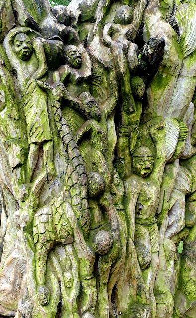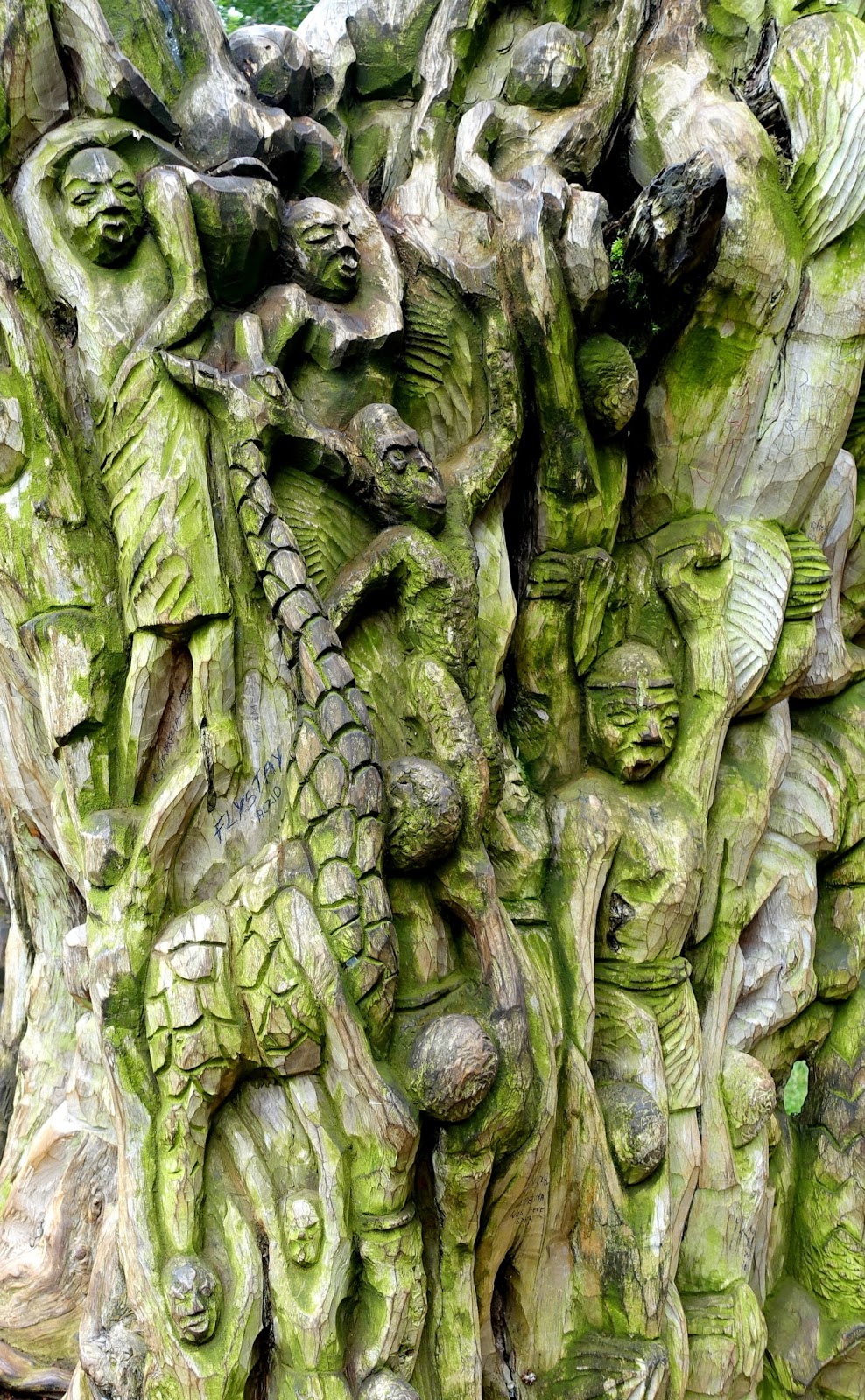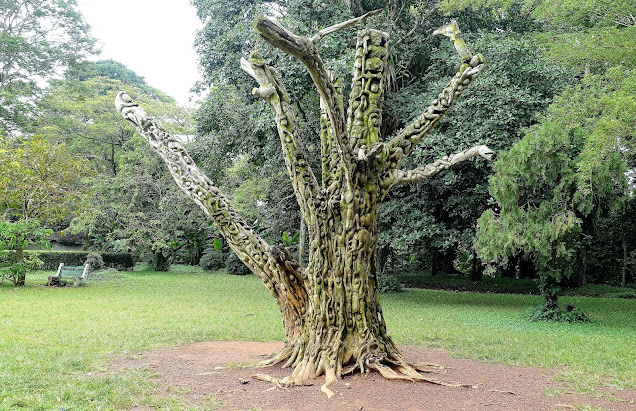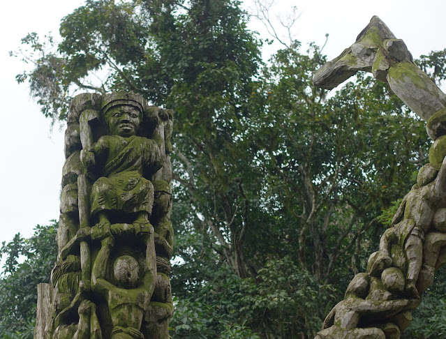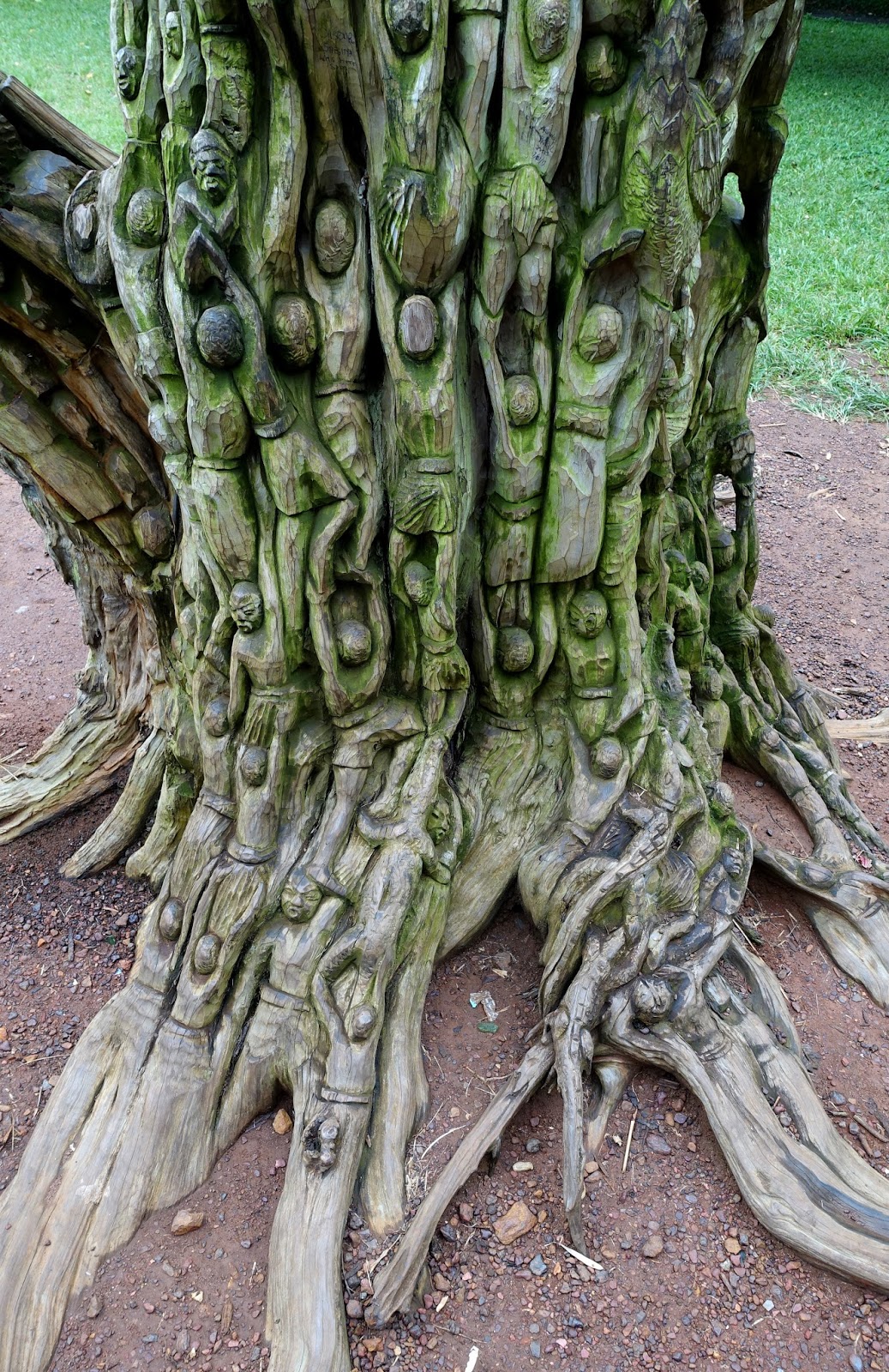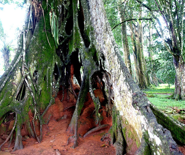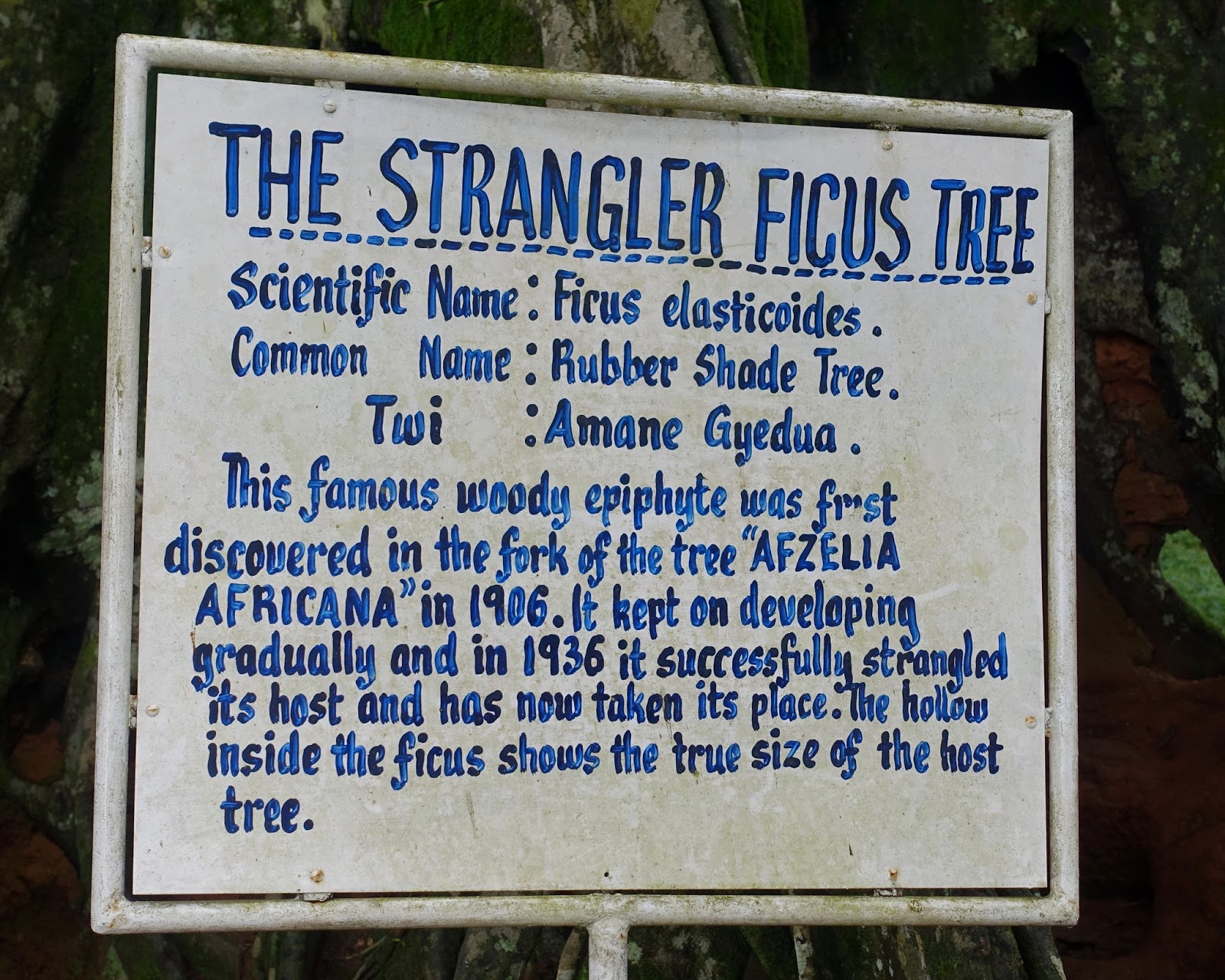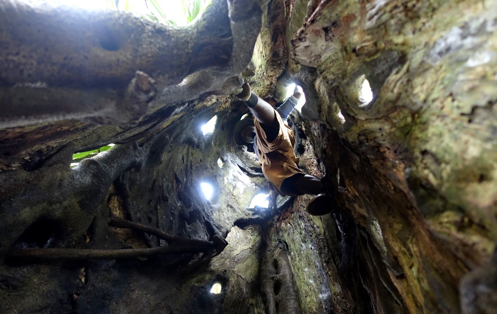 The first is ‘the strangler tree’. A tiny parasite settles into a crack in the tree, or on a branch. The seed germinates, sending out ‘air roots’ – stealing light from above and nutrients from below – as it envelops the host tree, gradually strangling it and killing it. The strangler takes on the very shape of the host as it retains the appearance of a tree. But inside it is hollow. The host has been destroyed and the hollow space which remains follows the contours of the former host – and it is so large that it is possible to climb all the way to the top inside the tree (as our guide is doing in photo #3).