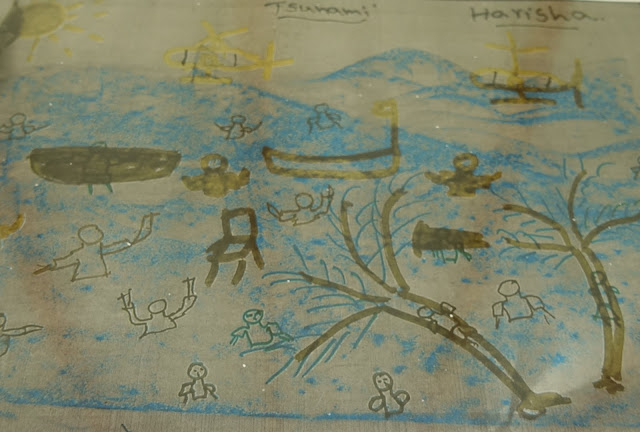 The poignancy of the visit lies with the artwork of children trying to describe and interpret what happened. You can see it displayed on the verandah in the photo above, behind glass (making photos without reflections difficult!).