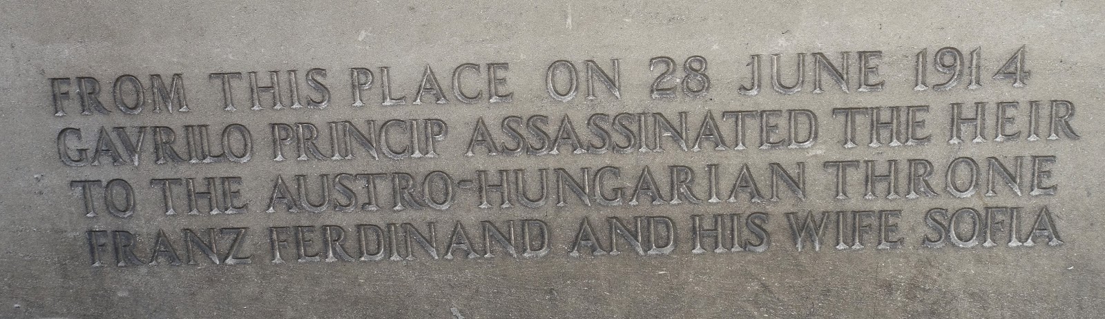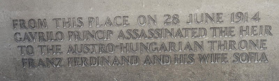 The Crown Prince of the Austro-Hungarian empire, Franz Ferdinand, visited Sarajevo with his wife, Sofia, in June 1914. An attempt on their lives was made on the way into the city (but the bomb detonated among the cars behind them). After berating the locals on their hospitality, Franz Ferdinand decided to pay a visit to the injured in hospital. They never got there. No one told the driver of the change of plans and so back they went on the original route. In trying to make the change, the cars stalled alongside the Miljacka River at a nondescript intersection, giving the assassin, 19 year old Serbian nationalist, Gavrilo Princip, his opportunity. Franz Ferdinand and Sofia were assassinated.
