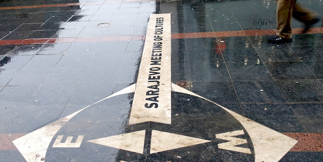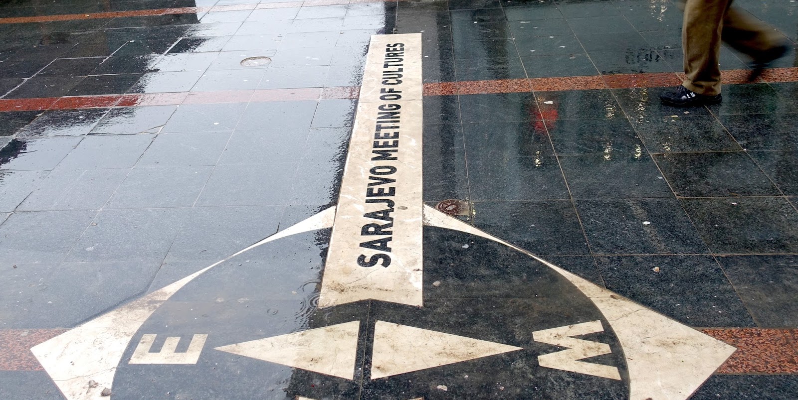 With snow on the ground, I missed it the first time I walked across it. The snow melted – and there it was: a line in the tiles and in the history of Sarajevo, capital city of Bosnia-Herzegovina (B-H) in the Balkans.