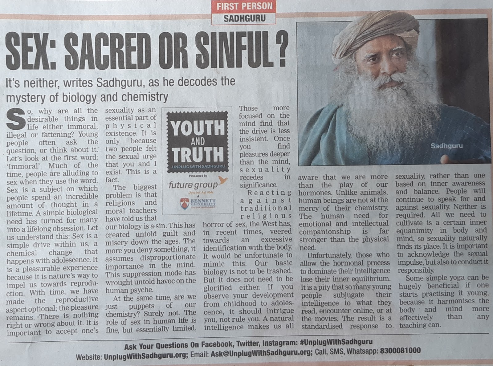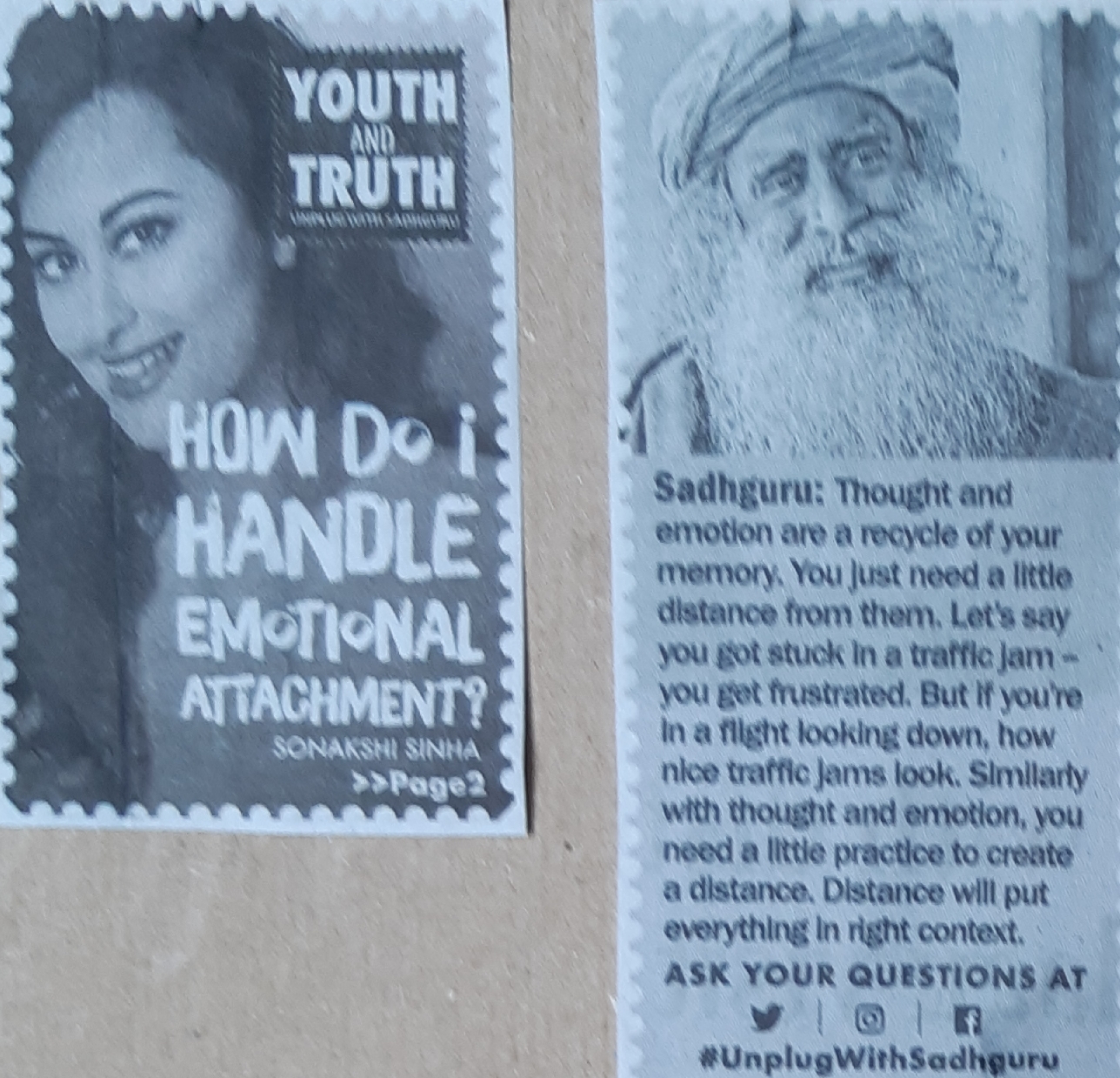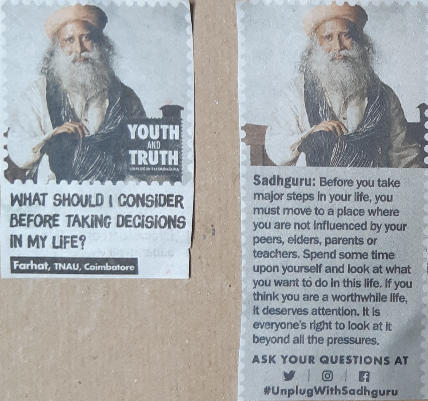 That is a weekly column, but the real fascination for me is what has happened on a daily basis. And almost two months later, it is still happening on a daily basis. Starting with the questions from the more famous people on that first cover page in August, each front page has had a little box with a question – to be followed by Sadhguru’s response on page 2 or 3, also in a little box. Here are three examples from the 20th August page (a cricketer and a couple of Bollywood actors – what other combo could get us started effectively in this context?!):
