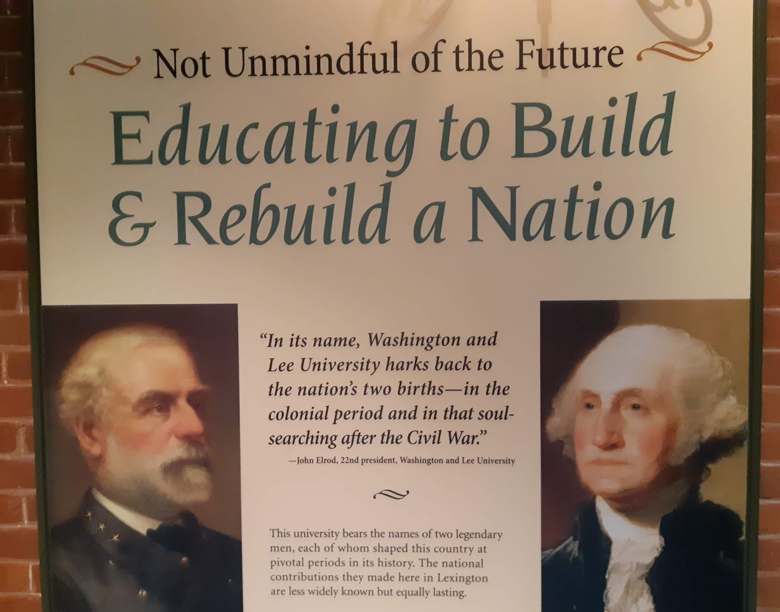 Believe it or not, this little town is home to two tertiary institutions. The Virginia Military Institute and the Washington & Lee College. Initially, it was just Washington College, named after the key figure in the birth of the nation. But Robert E. Lee, commander of the Confederate forces in the Civil War, was invited to be president after the war and so offering a leadership during the rebirth of the nation. After his death – and his body lies in the altar-space of a chapel, of all places – his name was added to the name of the college.