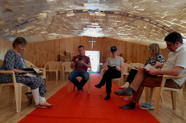 | KOTAGIRI, TAMIL NADU: In The Ark at the UESI/IFES Study Centre. We started each day with a portion from Isaiah 40-65, followed by a selection from Amy Carmichael’s Edges of His Ways – and a prayer. It was as we were seated here that Andy & Ines received the news that they had become grandparents for the first time. |