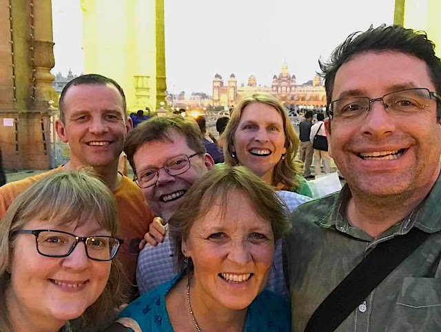 | MYSORE, KARNATAKA: A highlight of any visit to India is ‘the illumination on Sunday’, as one Mysore taxi driver described it to me. Not the Sunday sermon, but the 7pm flicking-of-a-switch to have thousands upon thousands of lightbulbs illuminate the Mysore Palace. We arrived in the gloomy twilight only to discover that some prominent person had died and that there would be no illumination. Without illumination, we resorted to imagination – coming up with the novel idea of a selfie at the gates of the Palace. [NB: for a post on the illumination, see here]. |