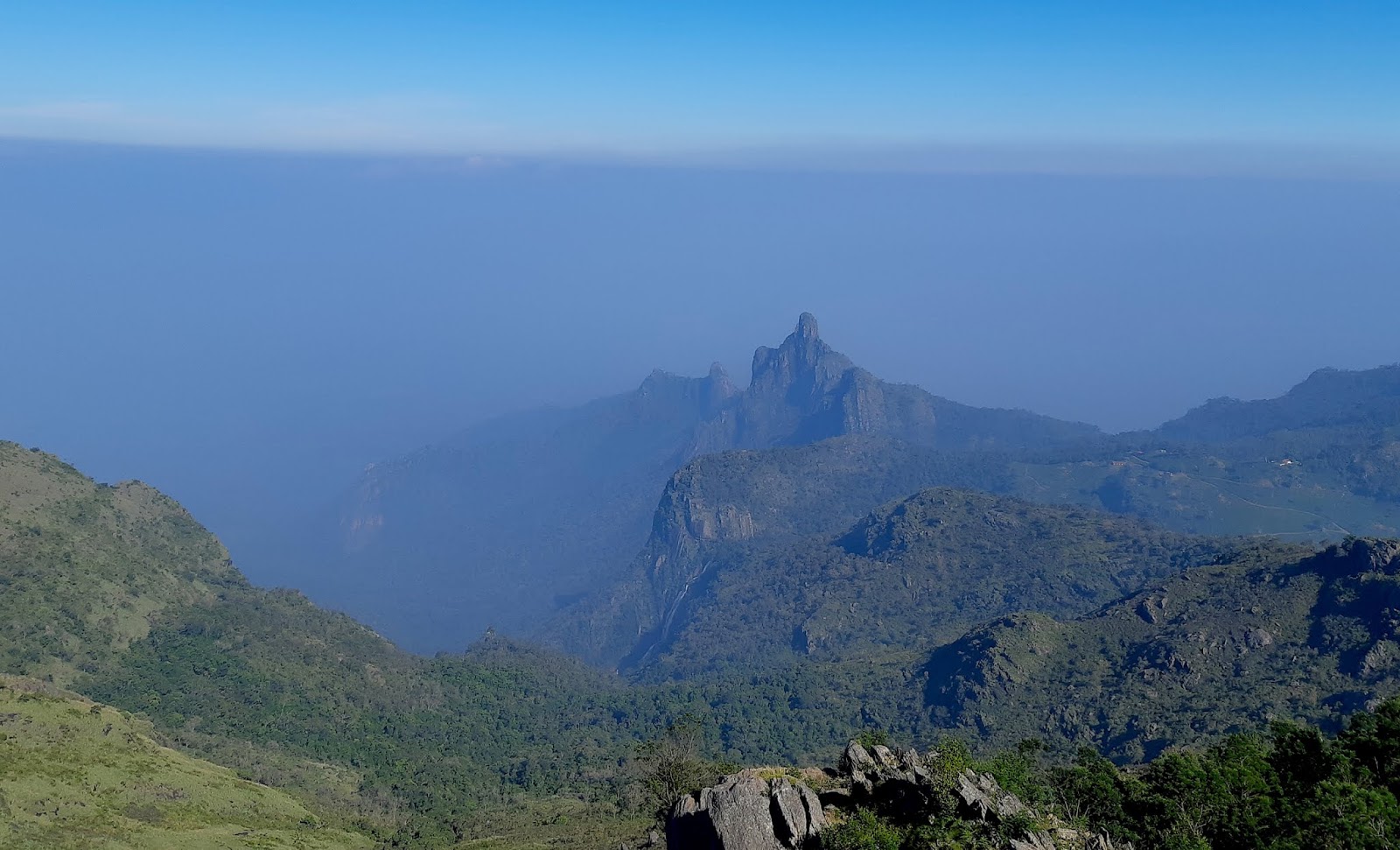 | MUNNAR, KERALA: The tea gardens in this area (especially Top Station) rival the Nilgiris as the best that I’ve seen. But this is another grand view, taken at 6.30 am on my phone, looking South from the verandah of our hotel room. |