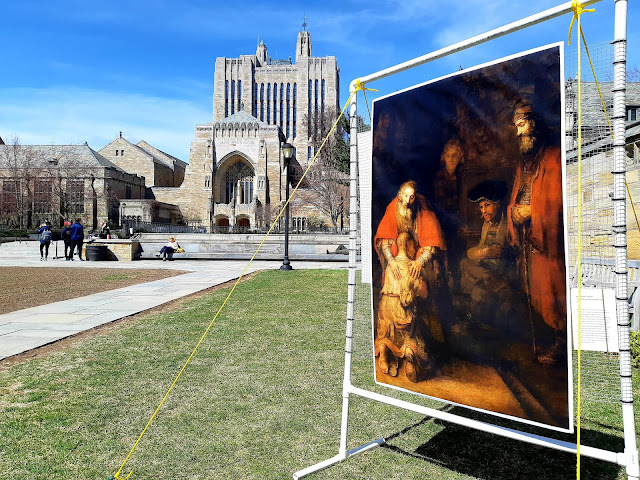 OMSC was also a favourite destination of the aforementioned Lamin Sanneh, a professor at Yale Divinity School, just up the road, literally – until his sudden death this past January. Very sad. We wandered down to Yale, walking through the campus, with all its resonances of Oxford and Cambridge. We stumbled across some art being put up outside the library and a man engaged us in conversation. As soon as he opened his mouth, there was something about the combo of the light in his face and the warmth in his eyes that drew me to conclude that he was a Christian. I was right. The Yale Students for Christ were hosting a Pop-Up Expo, Dare to Wonder, on the way to Easter.