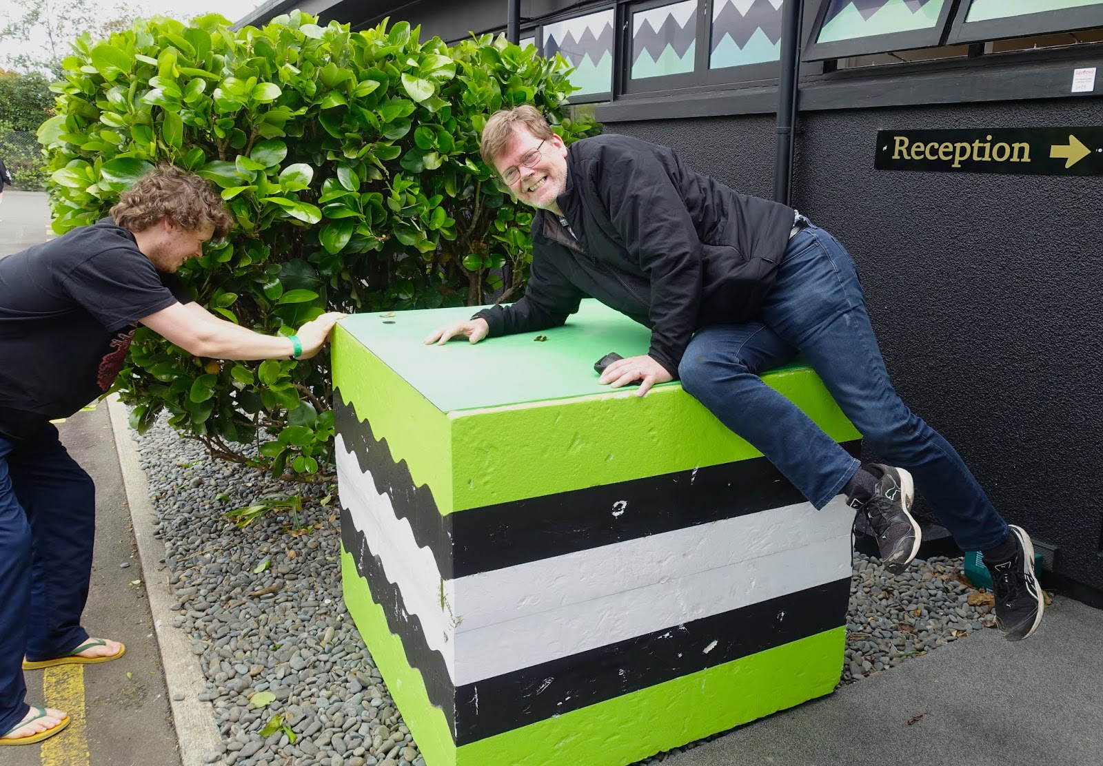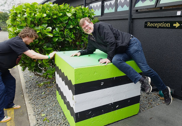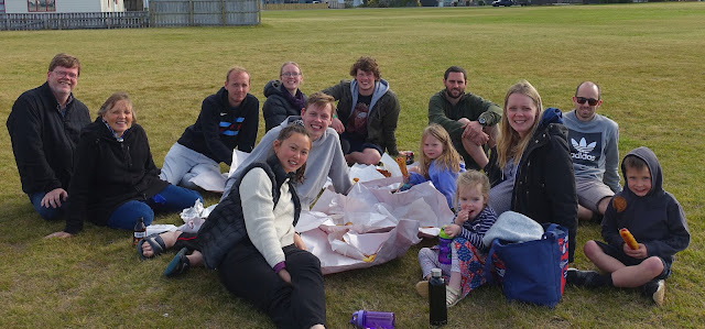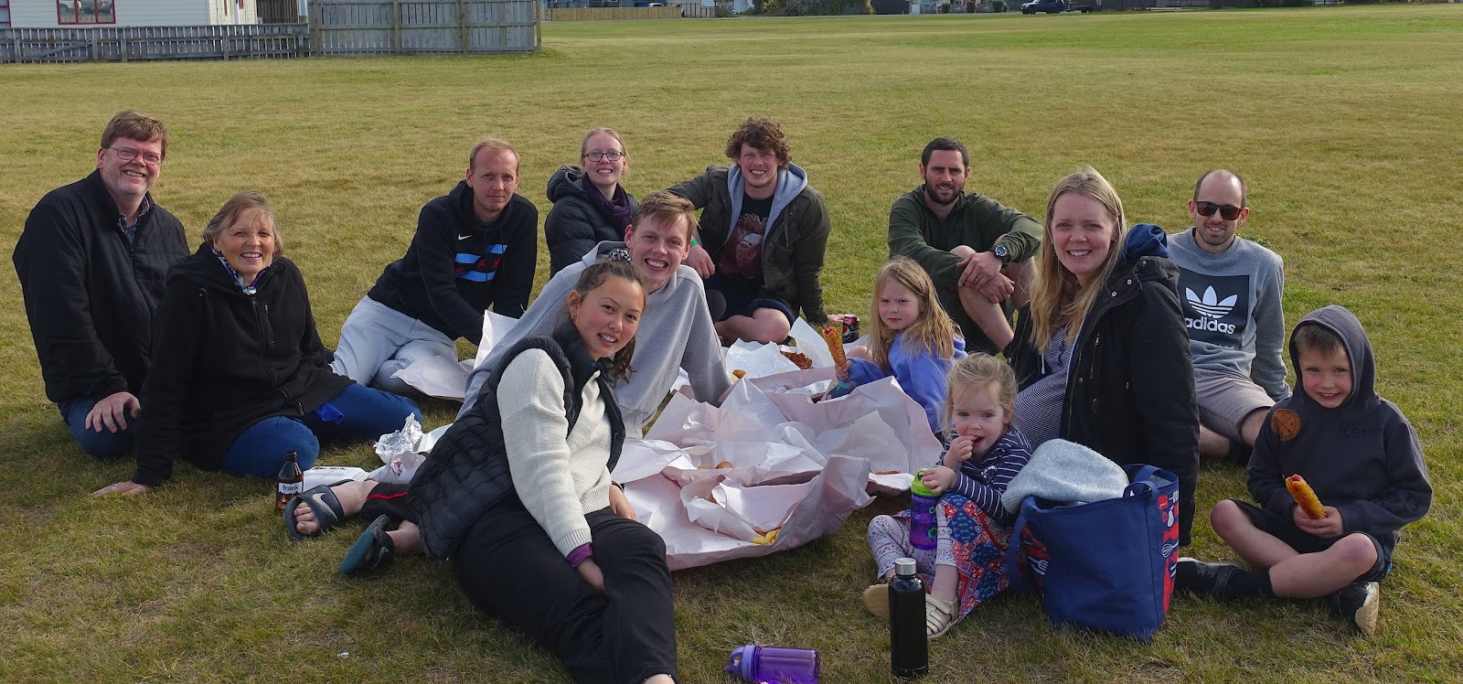 As has been his custom, my long-time friend, Mark Grace, just happened to be passing by (I keep bumping into him in random places when we make visits home), and his daughter, Hannah, kindly agreed to take a family photo as we were finishing off our fish ‘n chips on the grass outside the legend which is Mr Grumpys Takeaways at Foxton Beach. Here we all are.