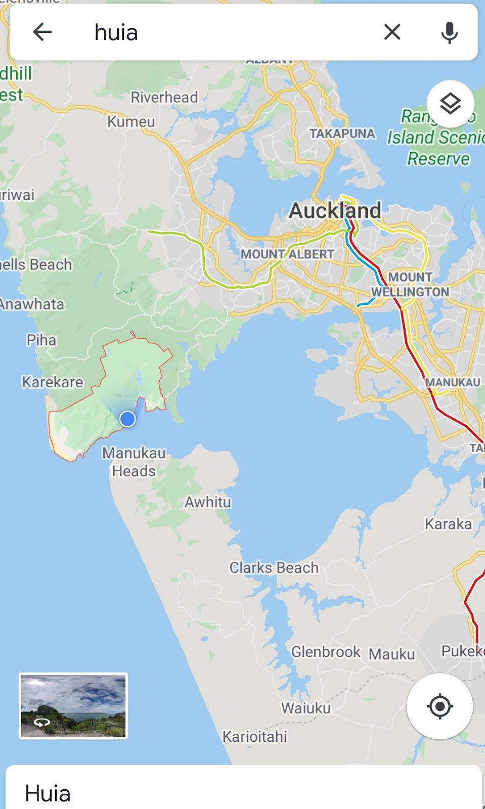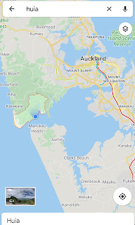 For those more geographically-inclined, the city of Auckland overflows from a central isthmus. It has two harbours coming at it: the Manukau, from the West, and the Waitemata, from the East. The blue dot represents Little Huia, while the blue inlet next to it is (Big) Huia Bay.