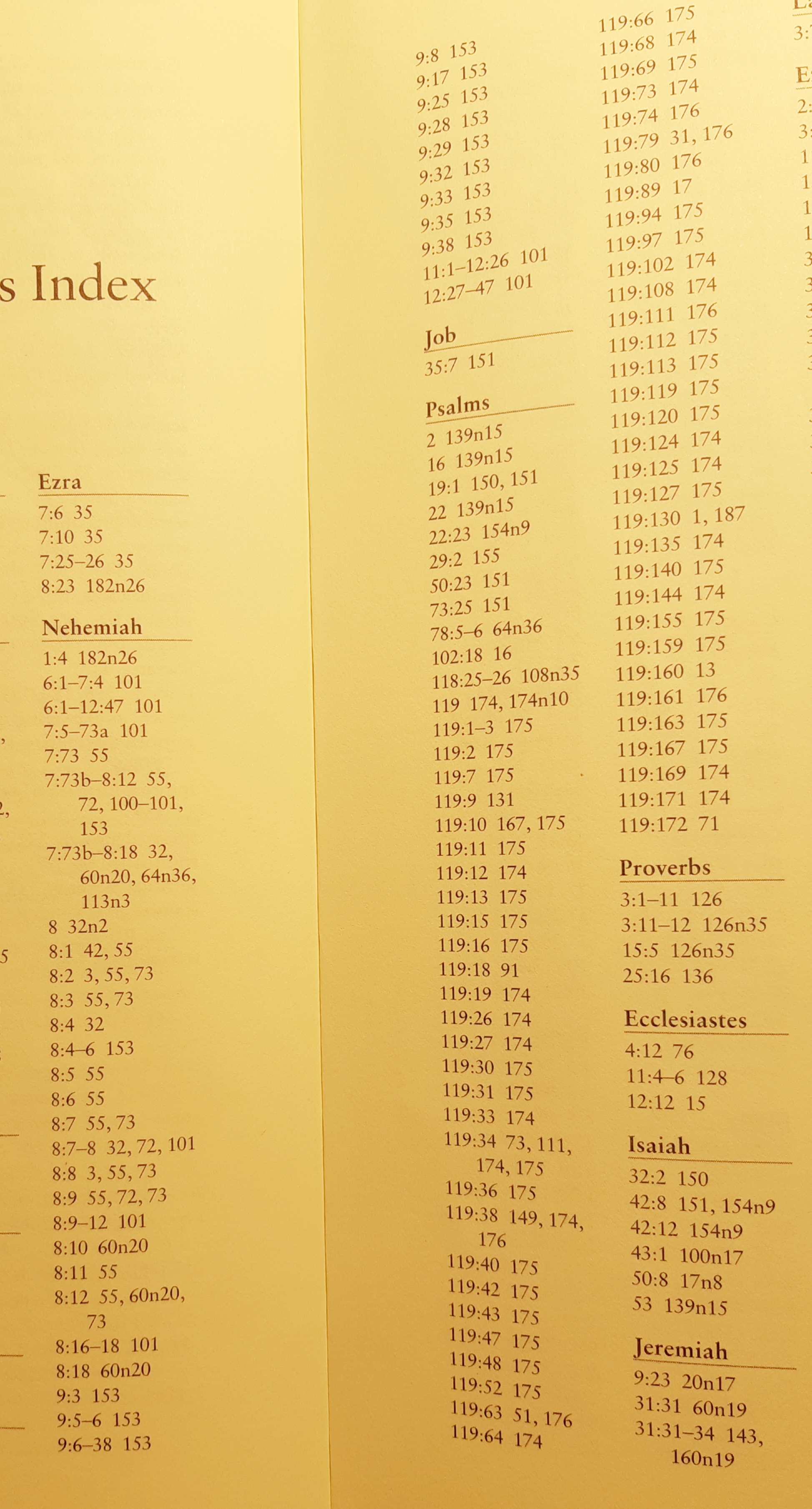 Every chapter starts with an extract from Psalm 119. Every chapter concludes with a Summary section. It is so helpful. Almost every chapter seems to return to Nehemiah 8, ‘functioning almost as a paradigm for preaching’ (32). Love it. The opening session of every entry level seminar in all the Langham training I’ve ever done commences with Nehemiah 8 & 9. [NB: the photo shows the way Nehemiah 8 and Psalm 119 dominate the Index, as discovered in the pale light of an early morning lamp!].