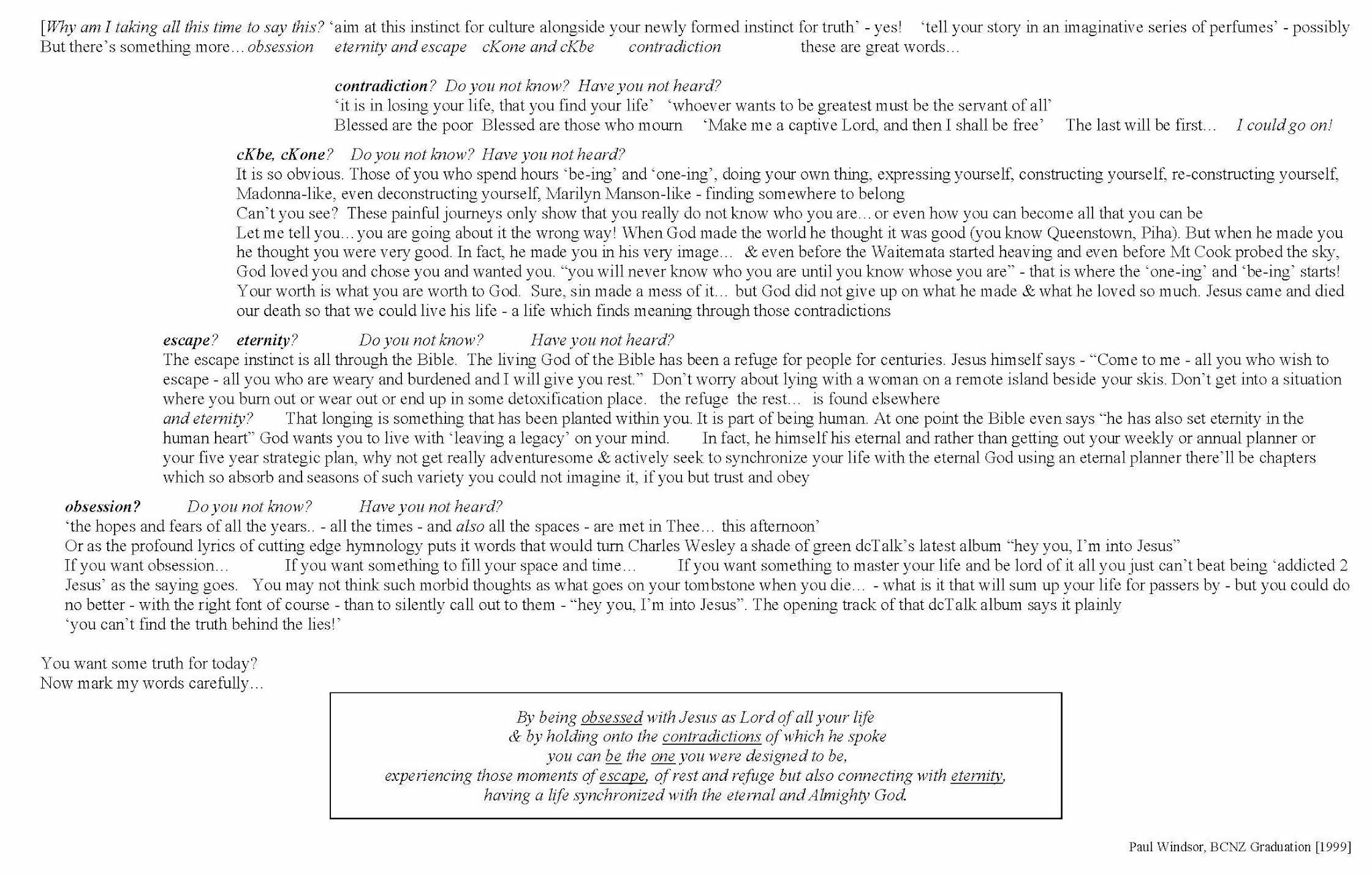 After I moved across to Carey Baptist College at the start of 1998, I was invited back to speak at the BCNZ Graduation Ceremony in 1999.  I made the decision to play a bit with the names of these six fragrances.  As part of my preparation, I read a biography of Calvin Klein and did my homework on each of the fragrances.  I wanted to try to demonstrate this flexibility and creativity because I was becoming fascinated, not just with how these six words captured the spirit of the culture — but how they could be reframed to capture the spirit of the gospel as well.
